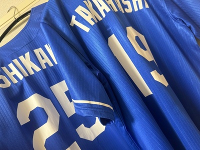 我が家には、息子用のユニホームがいくつか飾ってあります。ビジター用の高橋宏斗選手、石川昂弥選手に、沖縄キャンプ仕様の中田翔選手、金丸夢斗選手。