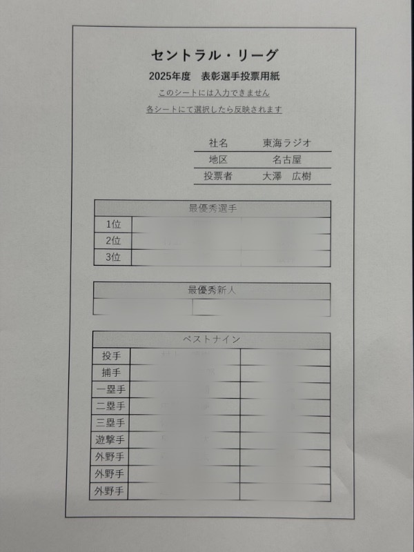今日、インターネット経由でプロ野球セ・リーグの「最優秀選手」「新人王」「ベストナイン」の投票を終えました。