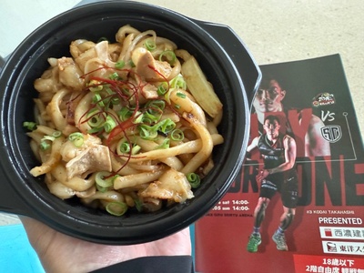 アリーナの外にはキッチンカーが並んでいます。これはFC岐阜のホームゲームと同じような光景です。わたしもあれこれ買ってみました。