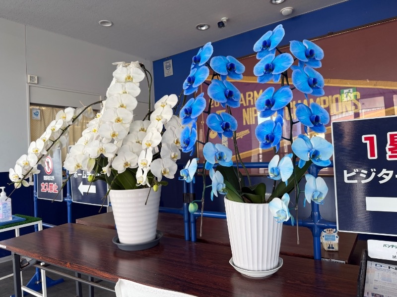 ナゴヤ球場の入り口には、ファーム日本一を祝っての胡蝶蘭が飾られていました。ブルーの胡蝶蘭、素敵ですね。
