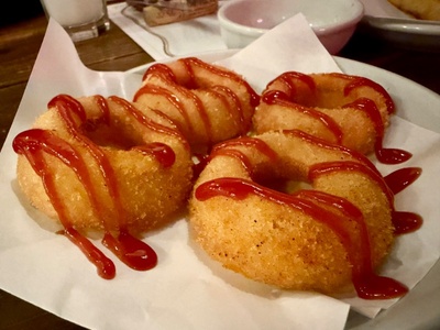 まずはオニオンリング(これも絶品)やポテトを味わいます。