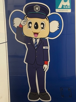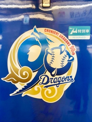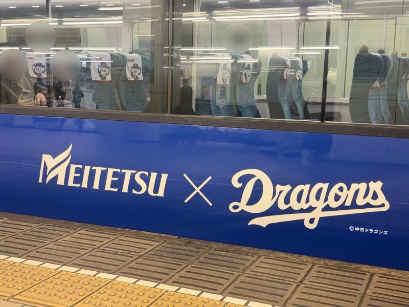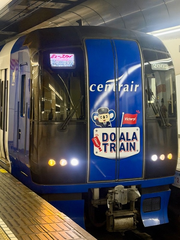 今日、名鉄名古屋駅で、中日球団マスコットのドアラが車両にラッピングされた「DOALA TRAIN」を発見しました! いや、時間を合わせました(笑い)。 名鉄「ブルーミュースカイ」のあちこちに、ドアラがラッピングされています。