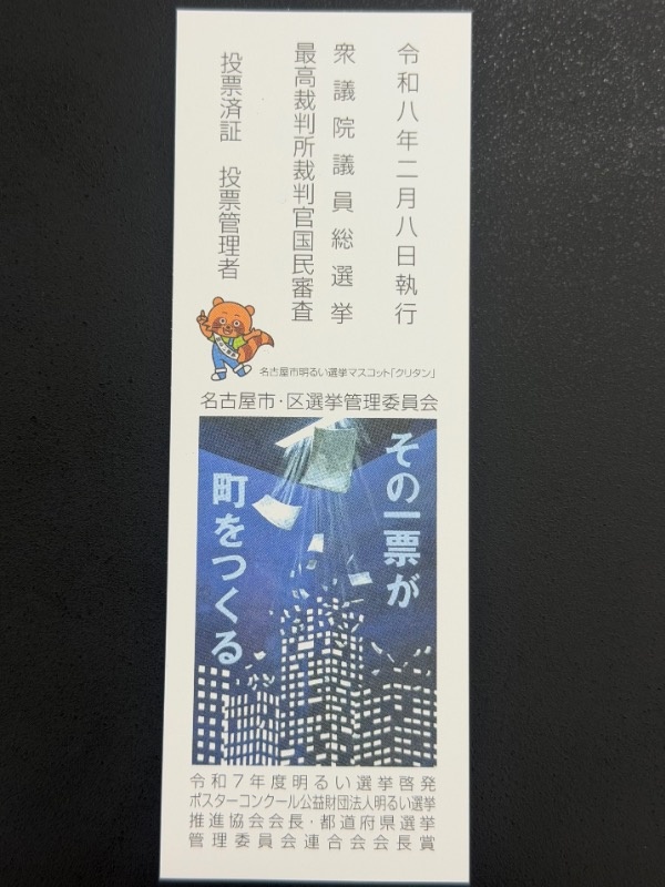 でも投票済証にあるように「その一票が町をつくる」のです。そして855億円も使っているのです。未来の日本のために、ぜひ一票を投じてください。