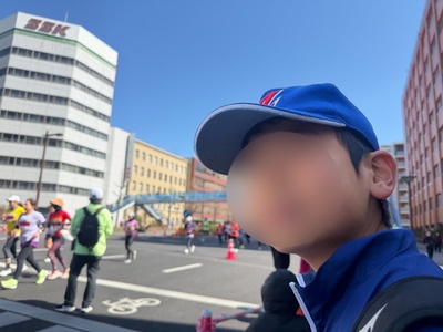 2人でコース沿道まで行って、走るランナーたちに声援を送りました。今日は風が強かったので、ランナーたちも大変だったことでしょう。