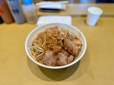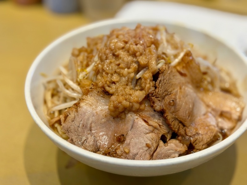 二郎系のお店って、野菜がおいしいんですよね。スープに絡んで。野菜をたくさん食べているので、健康にはいいに決まっています(笑い)。