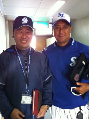 下の写真は2012年、サムスンライオンズ・落合英二投手コーチと、北谷球場での練習試合の際に撮った一枚。