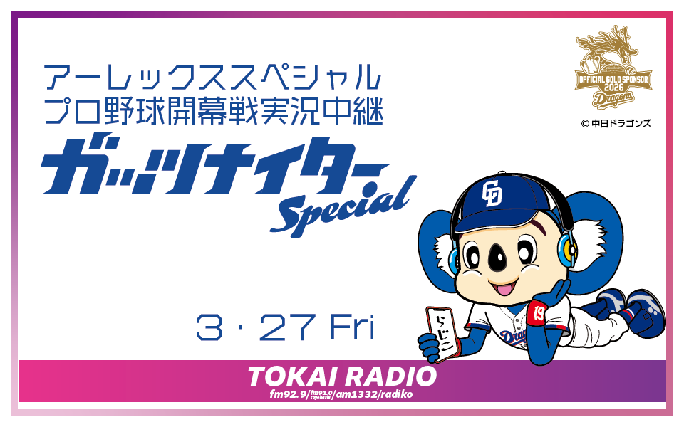 ゲストには、TOKAI RADIO ガッツナイター解説者でお馴染みの山﨑武司さんと、2026シーズンの「ガッツナイター」テーマソングを担当するwapitiが登場!ミニライブも楽しめます。